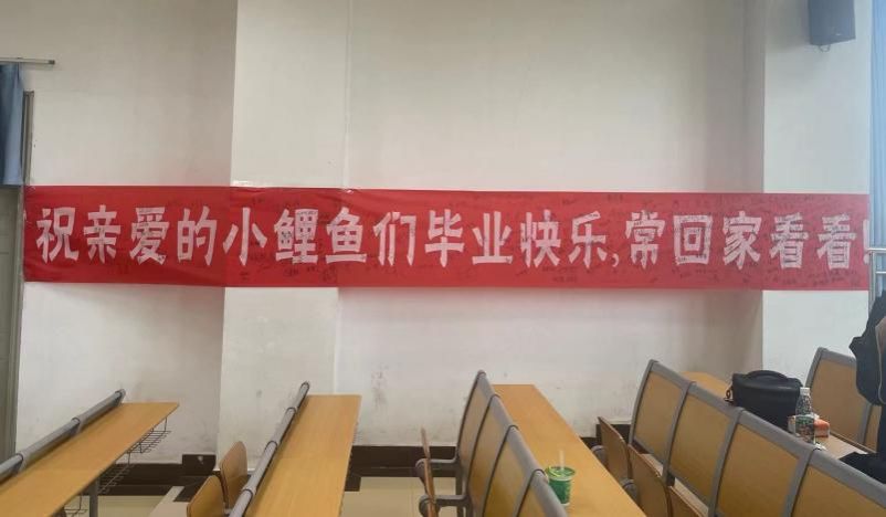 本次毕业典礼上设置了一块特别的横幅,除了“亲爱的小鲤鱼毕业快乐”的字样外,上面还写满了本届毕业生的签名及祝福。工力2001班学生黎坤孟感叹道:“都说毕业快乐,实际上我心里感到很不舍,很舍不得朝夕相处的老师和同学们。”信计2001班吴卫铭留下了自己的祝福:“祝全体毕业生都能鲤跃龙门,书写自己的华章,践行青年担当,为新质生产力时代的建设添砖加瓦!”