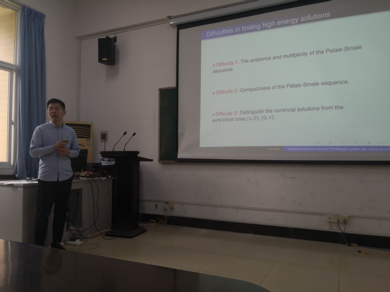 郭伦向参会师生介绍了近期关于含Sobolev临界指数增长的非线性薛定谔方程组的研究工作,由于临界指标的出现,导致方程组对应的能量泛函缺乏紧性。此类问题一直是偏微分领域的热点研究问题之一。通过对能量泛函的PS序列进行分解,再结合能量估计与拓扑度方法,得到了该方程组解的存在性以及多解性。