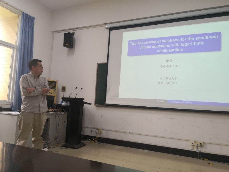 报告过程中,帅伟向参会师生介绍了近期的研究工作,关于含对数非线性项的椭圆型偏微分方程解的存在性与多解性,经过研究发现,对数非线性项前位势函数的符号对解的存在性影响很大。当符号为正时,存在能量发散于正无穷的解序列;当符号为负时,存在能量收敛于零的解序列;当位势变号时,同时存在上述两支解序列。