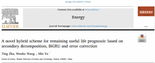 近日,我院博士朱婷、教授王文波、老师喻敏合作在《Energy》期刊上发表题为“A novel hybrid scheme for remaining useful life prognostic based on secondary decomposition, BiGRU and error correction”的研究论文。该期刊系JCR及中科院SCI双一区TOP期刊,2022年影响因子为8.857,该期刊重点关注能源经济分析、能源建模和预测、综合能源系统、能源规划和能源管理,是能源研究领域内最有影响力和最权威的期刊之一。朱婷博士为第一作者,王文波、喻敏为共同通讯作者,武汉科技大学为第一单位。