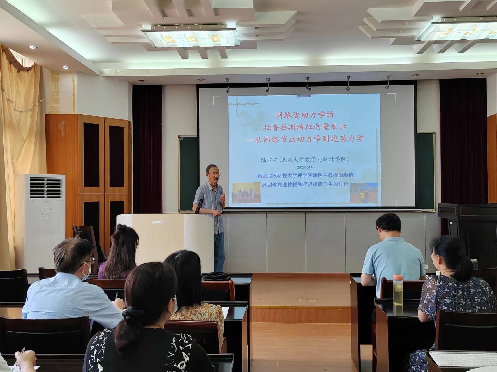 (通讯员苏青青)6月14日下午,武汉大学数学与统计学院陆君安教授、周进教授应邀为理学院作学术报告,题目分别为“网络边动力学拉普拉斯特征向量表示——从网络节点动力学到边动力学”和“复杂网络的牵制同步与排序”。报告会由我院院长丁义明教授主持。武汉大学王先甲教授、我院部分教师和研究生参加了此次报告会。