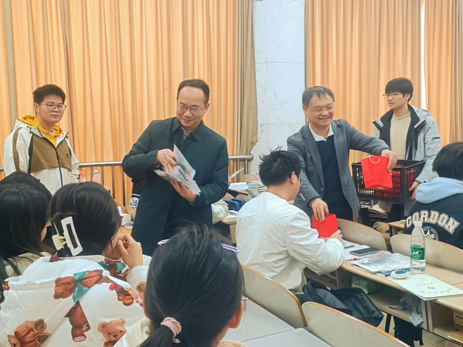 王文涛、丁义明、张传洲以及毕浩洋共同为考研自习室的学生们送出了水果和文具礼包。学生们在收到小礼物后,纷纷表达了对学院及领导们的感谢。材物2101班王铭浩表示,学院送来的不仅是一份份礼物,还是冬日里的温暖和关怀,更是学院对学生们的殷切希望和美好的祝福。