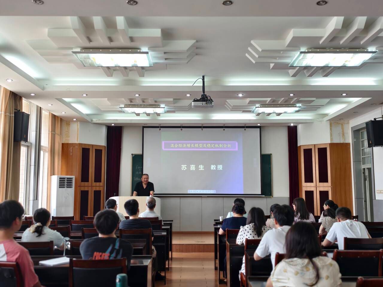 (通讯员苏青青)6月12日,联勤保障部队工程大学及我院系统科学一级博士点兼职教授苏喜生应邀为我院作学术报告,题目为“混合经济增长模型及稳定机制分析”。本次报告会由我院系统科学部主任涂俐兰教授主持,理学院教师及学生代表听取了本次报告。