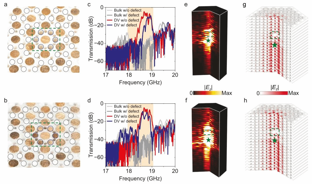 利用微波近场成像测量,研究团队直接观测到束缚于三维光子拓扑绝缘体中一维狄拉克涡旋线缺陷并沿其传播的拓扑狄拉克涡旋模式,如图3所示。此外,研究团队通过实验证明,光学拓扑狄拉克涡旋模式对各种缺陷和障碍物表现出强鲁棒性,如图4所示,使得其非常适合在三维空间中进行稳健的电磁波操控。研究团队的工作不仅首次将光学拓扑狄拉克涡旋态从二维扩展到三维,还为探索由三维拓扑光子晶体中的拓扑晶格缺陷所催生的新颖物理现象和实际应用提供了一个理想的平台。