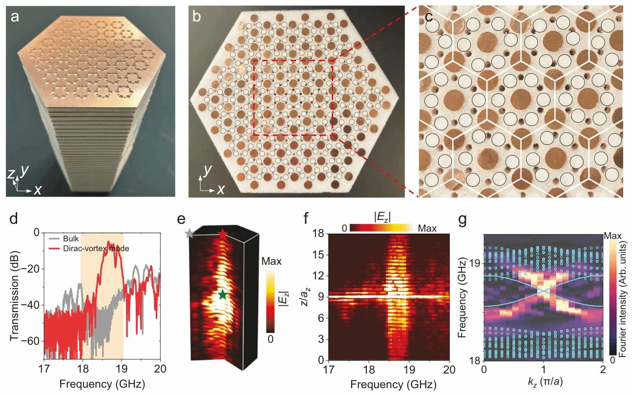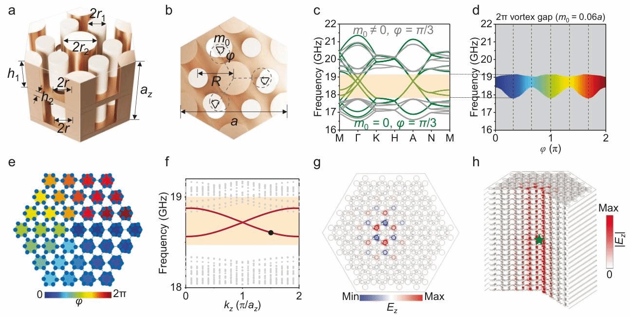 为了将拓扑狄拉克涡旋模式从二维光学系统拓展至三维光学系统,研究团队通过在三维类紧束缚金属笼光子晶体中引入 Kekulé 畸变,如图2a-2b所示,每一个介质柱都被周围的金属柱包围以束缚米氏共振,使得三维光子晶体中的矢量电磁波被简化为标量波,其体带色散也类似于标量波(如图2c所示),且与三维紧束缚模型的色散(如图1d所示)吻合。对三维类紧束缚金属笼光子晶体施加随位置变化的非周期性Kekulé畸变,由此引入随位置变化的质量项,如图 2e 所示。由此其体能带带隙中出现了一维拓扑狄拉克涡旋传输模式(红线),如图2f 所示。拓扑狄拉克涡旋模式束缚于一维狄拉克涡旋线缺陷并沿其双向传播,如图 2g-2h所示。