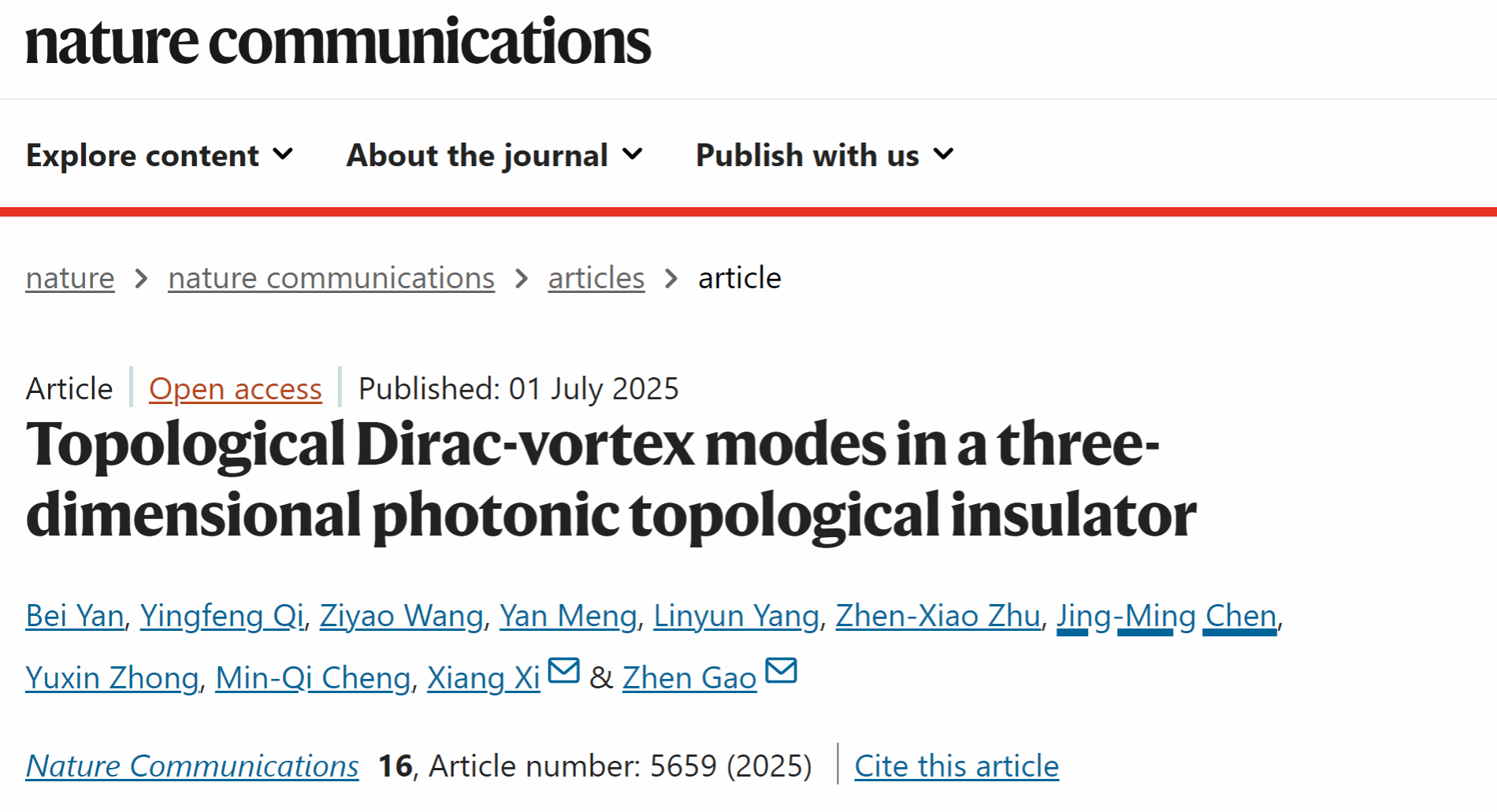 近日,我校理学院应用物理系青年教师颜贝与南方科技大学等单位合作首次在三维光学拓扑绝缘体中观测到一维拓扑狄拉克涡旋传输态,相关成果以“Topological Dirac-vortex modes in a three dimensional photonic topological insulator”为题发表在《Nature Communications》上。我校理学院应用物理系青年教师颜贝为该论文的第一作者,武汉科技大学为论文第二完成单位。