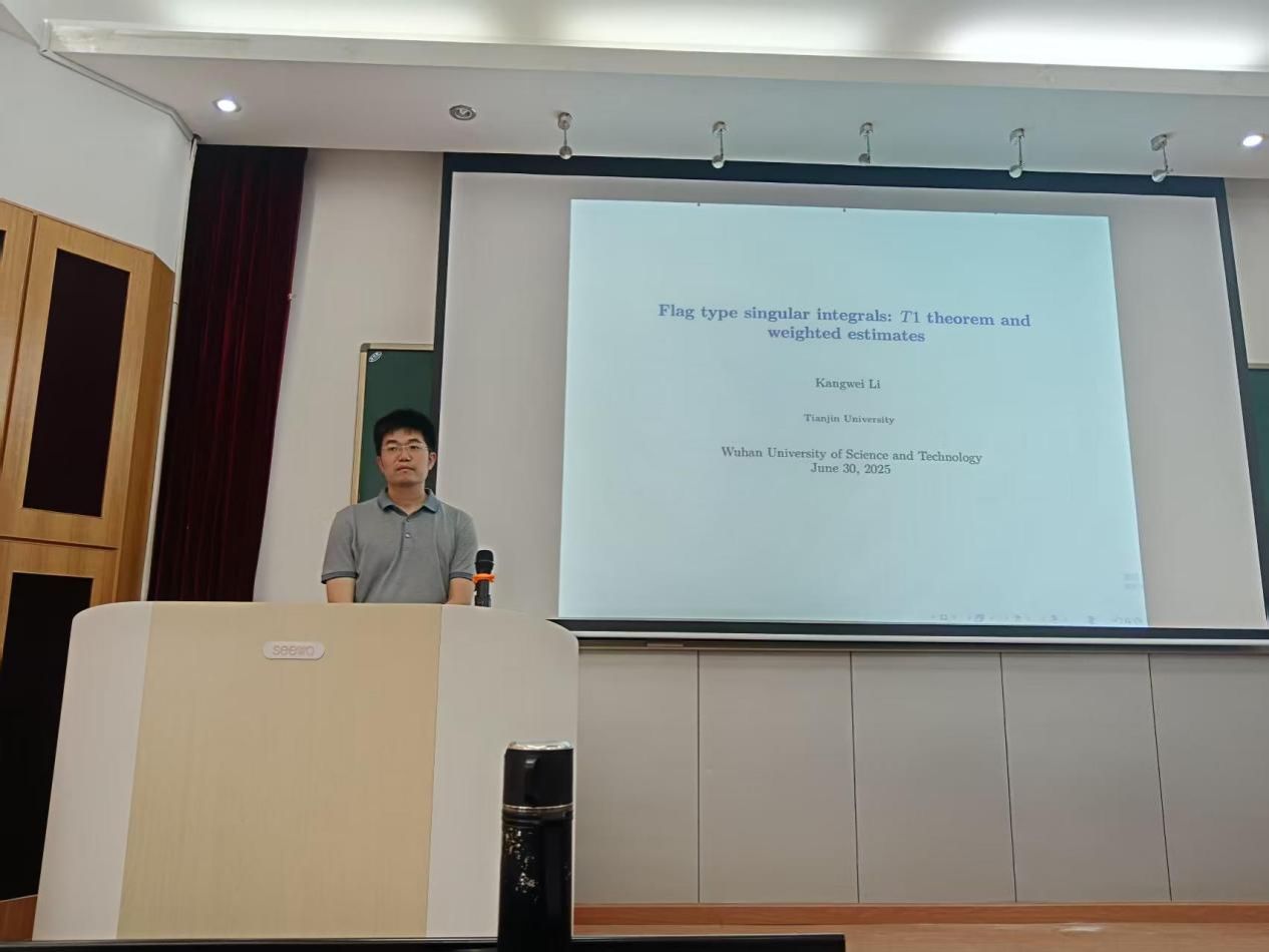 李康伟教授以 Flag Type Singular Integrals: T1 Theorem and Weighted Estimates 为题,深入浅出地介绍了其团队在多参数奇异积分理论领域取得的重要突破。