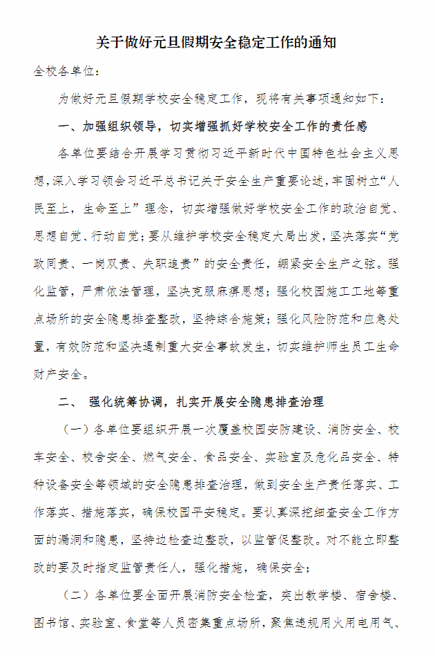 关于做好元旦假期安全稳定工作的通知