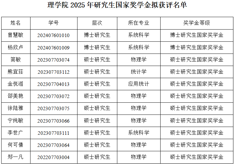 根据《武汉科技大学研究生奖助体系实施办法》(武科大研发〔2022〕60号)精神、《武汉科技大学研究生学业奖学金管理暂行办法》(武科大研发〔2022〕60号)、《武汉科技大学关于规范研究生学习年限的补充规定》(武科大研发〔2023〕68号)、《理学院研究生国家奖学金评定实施细则(2025年5月21日)》,经学生申请、导师推荐、班级测评、学院研究生国家奖学金评审委员会评审,拟评定曾慧敏、杨欣卢获博士研究生国家奖学金,简敏、熊宜荘、金悦湉、邵美艳、徐陆雅、宁纯敏、李世广、何可倩、郑一凡获硕士研究生国家奖学金。