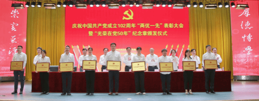 党委常委、组织部部长刘时新同志宣读有关文件。25名党员获“光荣在党50年”纪念章,50个基层党组织获得“先进基层党组织”称号,60人获得优秀共产党员”称号,50人获得“优秀党务工作者”称号。