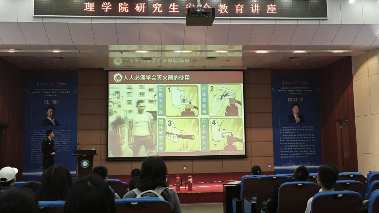 (通讯员蔡世豪 戴乐)为增强学生消防安全意识,帮助学生了解火灾扑救常识,11月20日,我院在崇实会堂开展了面向研究生的安全教育讲座,本次讲座由武汉市利民防火中心的教官周炳杰主讲,学院副院长宋华丽和何理,辅导员周玉瑾参会。