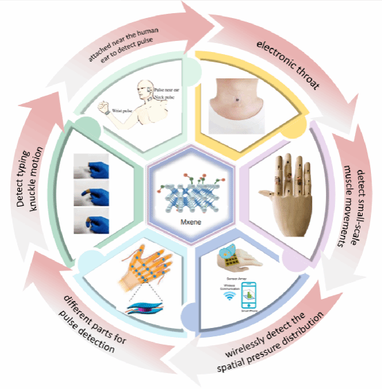 MXene是一种新型二维过渡金属碳/氮化物,具有高导电性、优异的机械柔性和丰富的表面官能团。其独特的层状结构使其对外界压力极为敏感,能够将压力信号高效转化为电阻变化。与石墨烯、黑磷等传统二维材料相比,MXene在稳定性、可加工性方面表现更优,尤其在潮湿或高温环境下仍能保持性能稳定,这为柔性传感器的实际应用奠定了基础。MXene传感器在医疗监测、智能穿戴、软体机器人等前沿领域的应用潜力。