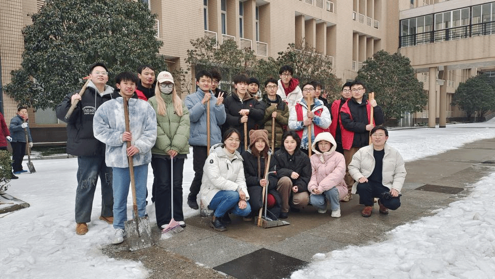 大家带着各自的扫雪工具,兵分两路,一组从理学院一楼大门前楼梯处开始铲,另一组从道路中间开始铲。刚开始,由于之前来往的人比较多,雪已经被牢牢附着在路面上,更是加重了清理的难度。为了快速清扫出一条安全干净的路,同学们分工合作,有的用力铲,有的紧随扫,还有的负责把雪运送到路边,彼此默契合作,进展顺利。