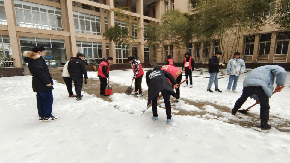 (通讯员杜茂林)我省新一轮雨雪冰冻天气,校园积雪严重,所以为了保障我院师生员工出行安全,理学院党委组织教师党员及在校学生在理学院楼前开展校园铲冰除雪行动,对冰雪覆盖区域较多、清扫难度大、走路容易摔倒的路面进行集中清扫。